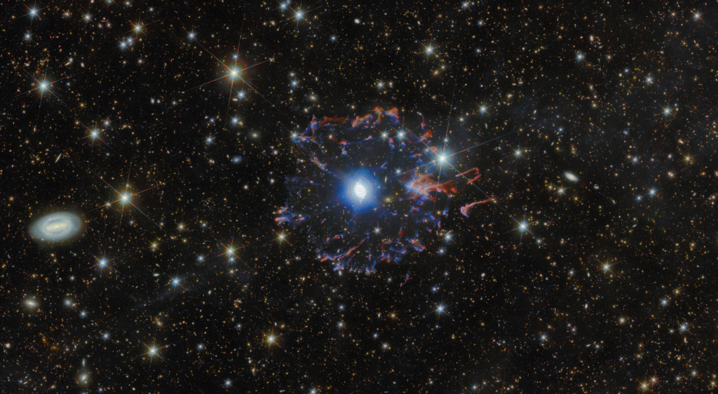 Hubble and Euclid today are able to photograph images with 20–30 times finer resolution than Herschel’s telescope at the time. They show something magnificent, an intricate and network of gas filaments and complex larger shock fronts where the ejected gas impacts into interstellar matter and a fragmented ring of previous ejecta from the same star. This is Euclid’s view: