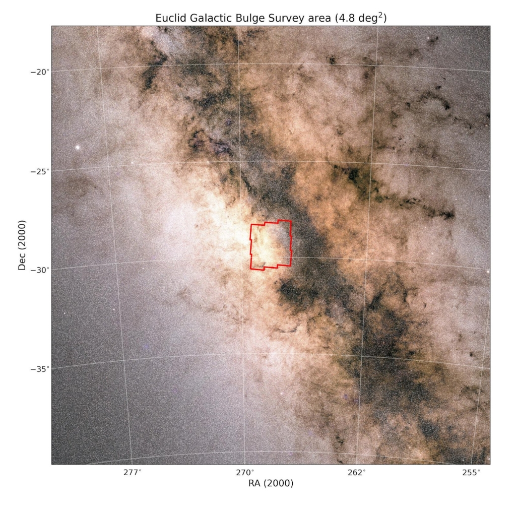 Outline of the mosaic of nine Euclid Galactic Bulge Survey pointings (in red) shown on a Gaia image of the Milky Way.